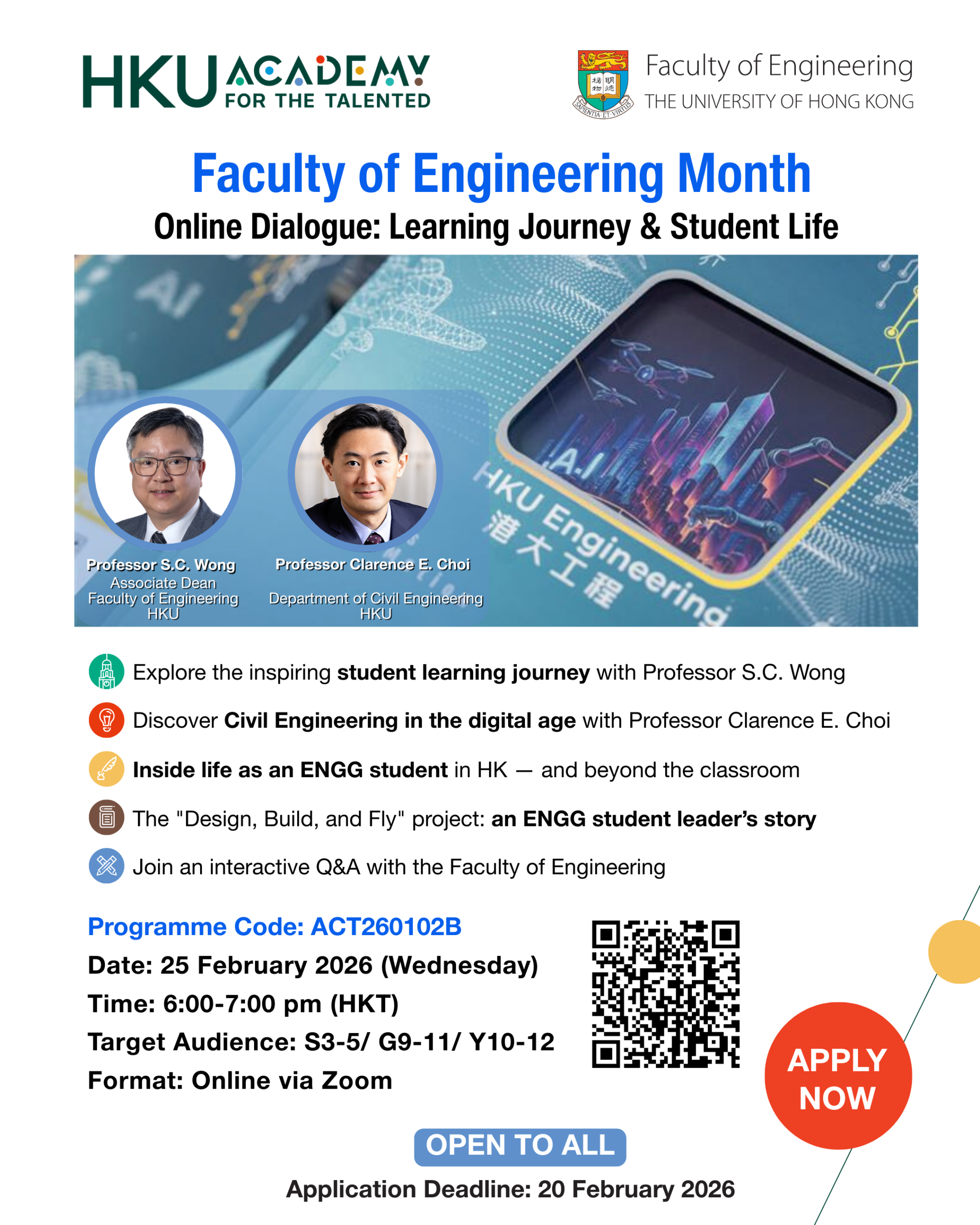 Join us for a session featuring insights from Professor S.C. Wong on the student learning journey within HKU Engineering. Gain an understanding of Civil Engineering in the digital era from Professor Clarence E. Choi, and hear authentic accounts from current students regarding their internships, overseas exchanges, and global learning. You’ll also have the chance to explore innovative projects at Inno Wing alongside HKU students, and interact through a Q&A session with Engineering Faculty members and students.