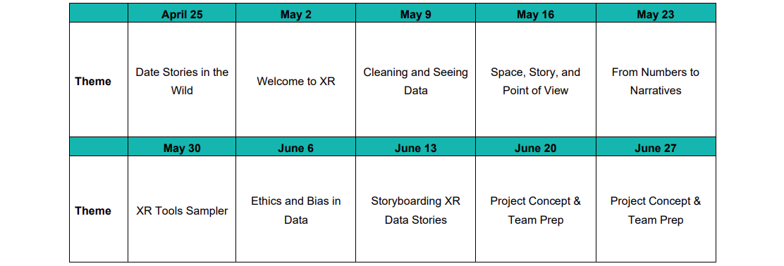 During the spring online phase, students meet on Saturdays to alternate between data science and XR topics: discovering meaningful patterns in datasets, learning how to tell compelling stories with numbers, and experimenting with immersive tools and spatial storytelling. In the summer camp, full days are structured around morning and afternoon lectures/labs that alternate between XR and data science, with a dedicated workshop every day where teams build their XR data projects step by step.