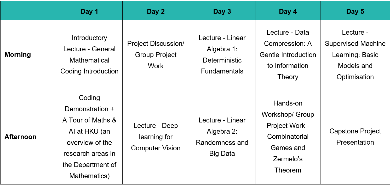 - explore classical and modern mathematical techniques used in AI through lectures delivered by academic experts in computational mathematics, optimization and related fields;